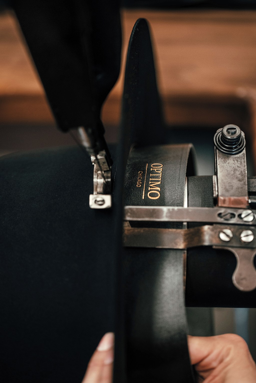 Once the hat passes inspection, it’s off to the trimming room. Here, a sheepskin sweatband is snipped to size and installed with a vintage Singer sewing machine. (Thompson finds the older models to be of higher quality.) The brim is cut, and the edges are either welted, bound, curled, or, in some cases, left raw. The treatment affects not only the look but also how the brim snaps and holds.